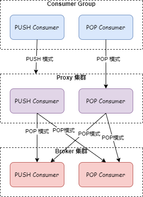 注意:消费者请求 Proxy 时,POP 模式和 PUSH 模式都可以使用,而 Proxy 请求 Broker 时,使用的是 POP 模式,这样可以避免上面提到的一系列问题。如下图: