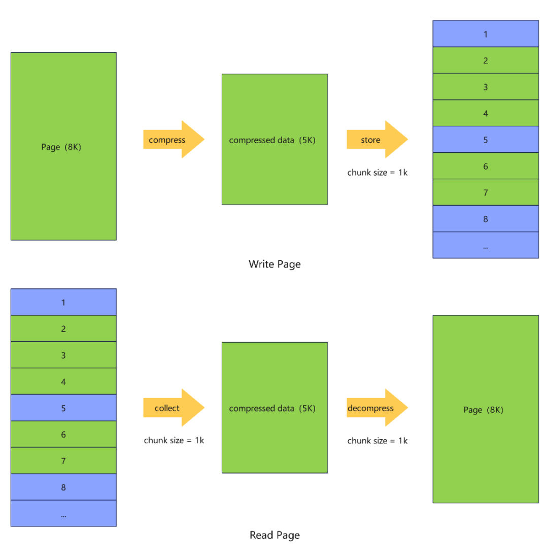 以一个页面为8K,chunk大小为1k,且压缩后大小为5K的页面为例,读写过程中,其原始数据和压缩存储的数据对应关系如图: