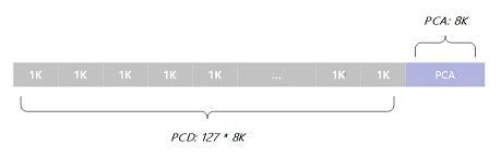 压缩后的数据存于一定数量的chunk中,而这些chunk的数量和位置信息也需要存储,这两部分内容分别存储于pcd(页面压缩数据)和pca(页面压缩地址)两个区域内,pcd存储以chunk为单位的压缩后数据,pca存储每个页面对应的chunk数量和地址等信息。如下图所示: