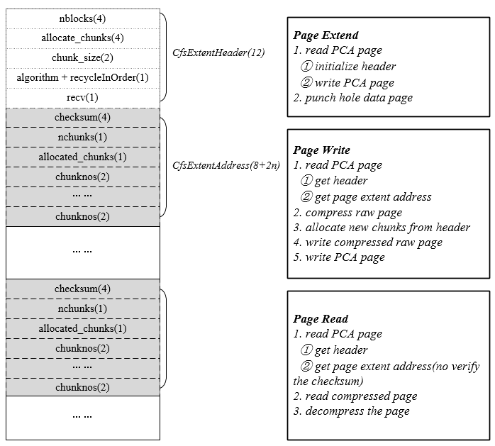 一个压缩数据`cfsExtent`,由一个pca页面管理,其详细结构如下图: