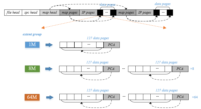 | Group | Extent size | Extent logical page count | Extent count range | Total logical page count | Total size | File Name || ----- | ----------- | ------------------------- | ------------------ | ------------------------ | ---------- | --------- || 0 | 8K | 1 | / | / | / | 1 || 1 | 64K | 8 | [1, 16] | 128 | 1M | 2 || 2 | 1M | 127 | [17, 143] | 16252 | 128M | 3 || 3 | 8M | 1016 | [144, 255] | 127K | 1G | 4 || 4 | 64M | 8128 | [256, ...] | ... | ... | 5 |