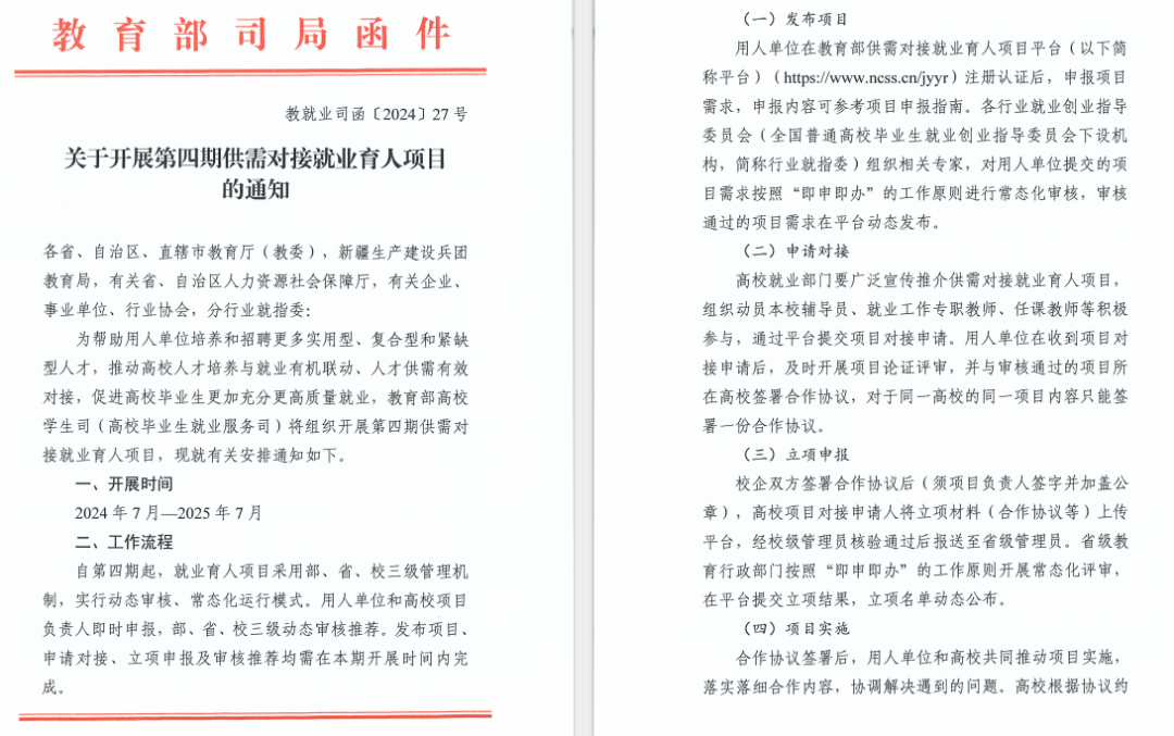 公司将组织专家对高校《项目申请书》进行评审,与评审合格的高校签定项目协议,请高校申报人于2025年6月30日17:00前登录教育部供需对接就业育人项目平台,提交校企合作信息并上传双章版《校企合作协议》。
