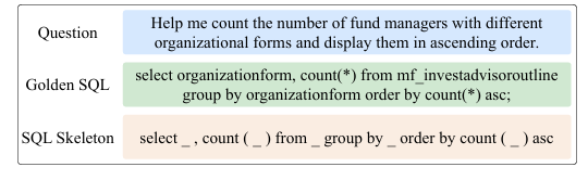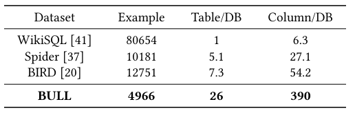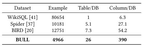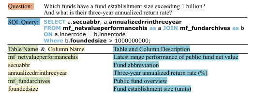 然而,目前尚无用于金融分析的Text-to-SQL基准数据集,现有的Text-to-SQL方法也没有考虑到金融分析中所用数据库的独特特征。为了解决这些问题,本文基于恒生电子的智能投资辅助产品构建了一个实用的金融分析Text-to-SQL数据集BULL。BULL数据集包含三个数据库,分别对应基金、股票和宏观经济领域,有由恒生电子的金融专业人士、数据科学家和软件工程师标注的自然语言问题-SQL的查询对。而且,BULL数据集有中英文两个版本。