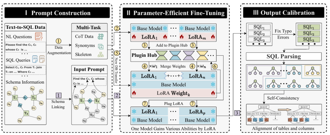 为了解决这些问题,本文提出了一种基于LoRA的高效参数微调框架,支持低资源微调以及跨数据库泛化。该框架由基于LoRA的高效参数微调(PEFT)方法、LoRA插件中心和权重合并方法组成,分别实现了低计算成本、低存储成本和跨数据库泛化。