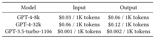 不同的大模型具有不同的上下文长度,通常以token数量来衡量。比如GPT-4提供8k和32k token的上下文长度。大模型一次能够处理的信息量是有限的。实验中可以通过使用它们各自的付费API接口来访问ChatGPT和GPT-4模型。这些模型的定价如下: