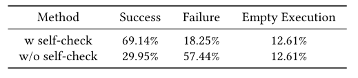 这其中,首先过滤掉执行结果为空的SQL,这一步非常关键,因为当黄金标准的SQL和生成的SQL执行结果都为空时,很难确保这两个SQL查询之间的语义一致性。同时,作者还设计了执行自检查步骤,排除与黄金标准SQL查询执行结果不同的生成SQL查询。实验展示了有无自检查生成思维链的成功率对比:
