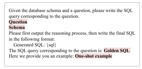 上图可以看到一个用于指导大语言模型的提示模板。在这个提示模板中,首先给大语言模型一个生成思维链内容的示例,指定所需的生成风格,然后提供黄金标准的SQL查询,要求大语言模型生成与之相关的思维链内容。由于只需要思维链内容而不是问题对应的SQL,于是可以通过这种方式获得良好的思维链内容。