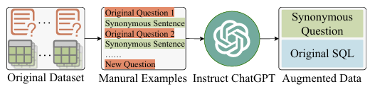 为丰富问题风格的多样性,作者利用ChatGPT自动生成同义问题,如图所示,首先人为手动编写几个问题及其同义句作为少样本示例,随后将给定的问题与这些示例连接起来形成一个综合提示,该提示指导ChatGPT生成同义问题。