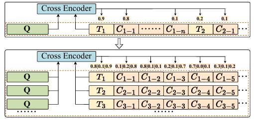 作者提出了一种并行交叉编码器模型,用于快速准确地检索模式项。此处不是将模式项串行化为单个序列,而是将表组织成一个批次,每个元素代表一个表及其相应的列描述。这个批次的大小与表的数量相同,然后被输入到修改后的交叉编码器模型中,使其能够并行预测每个表及其相关列的概率值。这种并行交叉编码器模型能够从数百个模式项中快速准确地检索出相关的表和列。