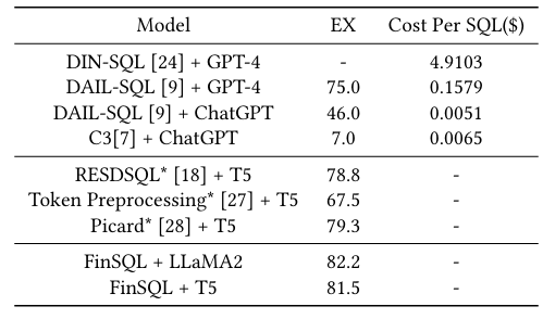 基线模型:实验在金融数据集上进行实验,并与以下基线模型进行比较:DAIL-SQL,DIN-SQL,C3,RESDSQL,Token Preprocessing,Picard。