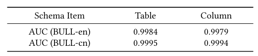 为了评估FinSQL模式链接方法的有效性,我们采用受试者工作特征曲线下面积(AUC)作为评估指标。实验结果显示BULL-en和BULL-cn中表的AUC和列的AUC均大于0.99。这些指标验证了FinSQL方法的稳健性,表明在两个数据集中都能精确识别相关的模式项。