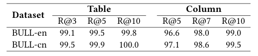 此外,实验对并行交叉编码器模型进行了实验,该模型的有效性通过召回率(R@k)指标来衡量。实验表明,在BULL-en中,该模型在表召回率方面表现出色,R@3、R@5和R@10分别达到99.1%、99.5%和99.8%。在BULL-cn中,它的表现更为优异。在更复杂的列召回任务中,该模型在BULL-en和BULL-cn中的召回率都高达96%以上。这些结果突出了该模型在处理多语言数据集时具有卓越的精度和召回率,这对于Text-to-SQL任务的后续阶段至关重要。