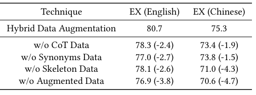 本文提出一种混合数据增强方法,包含三种数据形式:思维链、同义问题和SQL框架,分别对应推理能力、有意义表达和SQL结构。