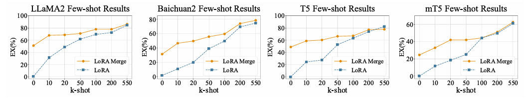 在实际应用中,随着业务的增长,新数据库会迅速构建。对于一个新数据库,训练数据的数量是有限的,因此有必要进行少样本微调以克服这种低资源场景。本文提出一种基于权重合并的少样本LoRA微调方法,以实现高效的跨数据库泛化,并处理新数据库的Text-to-SQL任务。