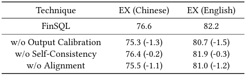 实验研究输出校准技术对模型性能的影响。输出校准包括自一致性和对齐两种方法。结果以中文和英文的执行准确率进行量化。研究结果表明,排除输出校准会导致中文的EX准确率降低1.3%,英文降低1.5%。缺少自一致性会导致中文下降0.2%,英文下降0.3%。最后,去掉对齐会导致中文的EX准确率下降1.1%,英文下降1.2%。这进一步证实了在两种语言环境下,观察到的EX下降确实与排除输出校准有关。