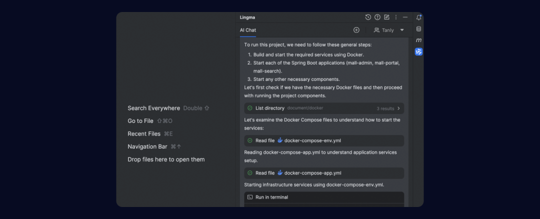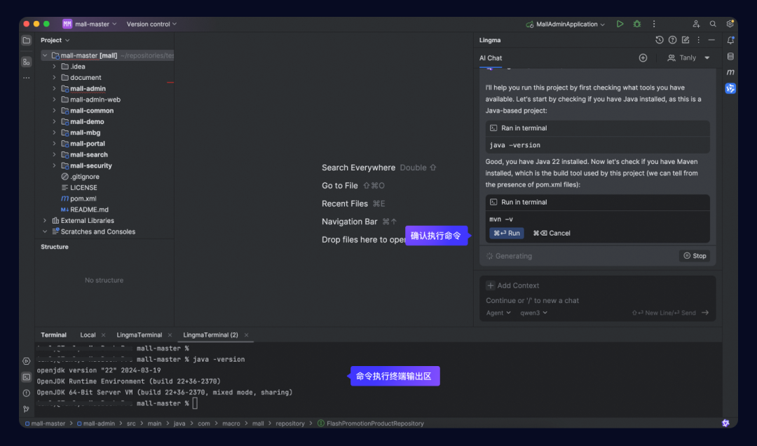 智能体模式可根据当前需求自主决策进行终端命令编写与执行,为保障命令执行的确定性,默认每次执行命令前需要开发者进行确认:- 单击运行按钮,智能体会将命令发送到 IDE 的 Terminal 窗口进行运行;