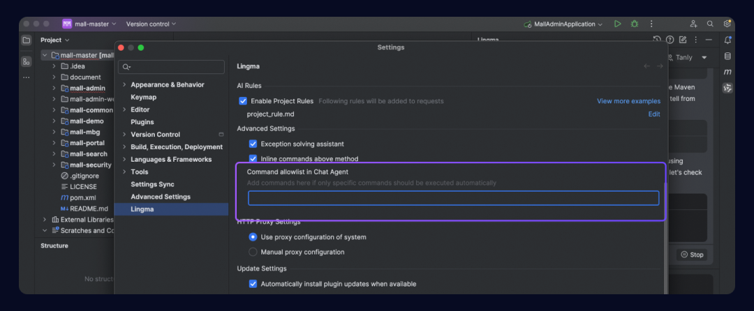 对于需要后台运行的命令,将会出现“后台运行”的标记,智能体将继续后续任务,并且会在需要的时候主动检查或获取终端输出结果。当然,开发者可以在插件设置中,配置自动执行的命令允许列表,配置好的命令,可以无需确认自动执行。如需添加多个命令,可以使用英文逗号分隔。