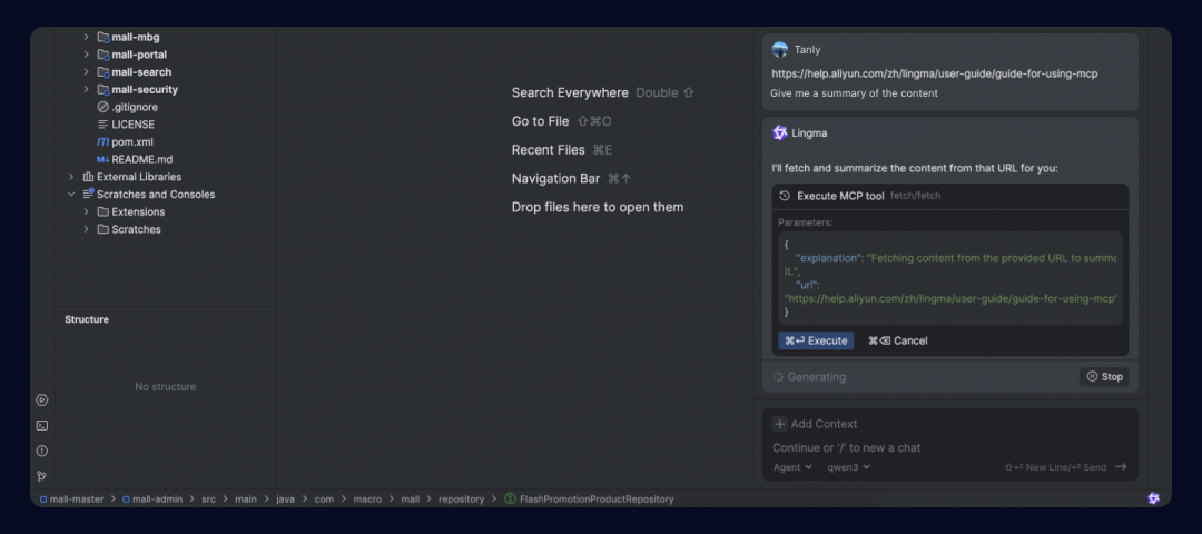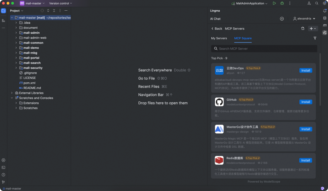 - 集成魔搭 MCP 广场:深度集成魔搭社区 MCP 广场,让开发者无需离开 IDE 即可一键安装,轻松调用超过 2400 种专业的 MCP 服务。