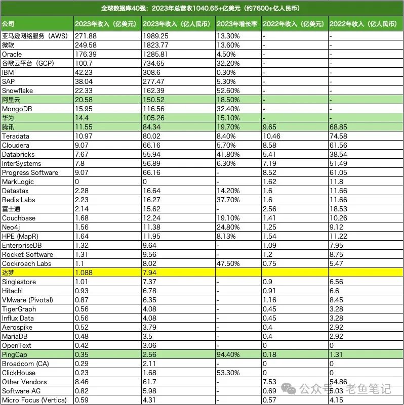 Merv的博客发布了两张表,老鱼为了方便大家阅读,不仅翻译了这两张表,还将其合并成了一张更直观的表格。同时,为了方便对比,老鱼将国产数据库营收头牌达梦(按营收)列入其中,看看国产头牌营收,在全球大概是个什么样的水平。