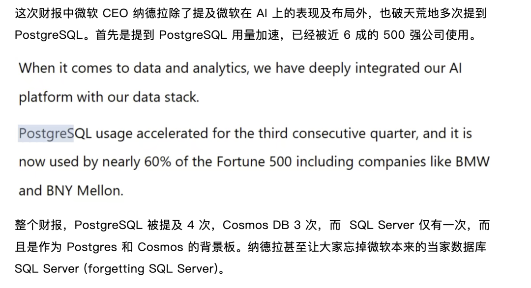 纳德拉说 PostgreSQL的使用量连续第三个季度加速增长,现在已被近60%的《财富》500强公司使用,包括宝马和 BNY Mellon 等公司。详情请看 Bytebase 发表的《纳德拉财报点名Postgres,助微软夺回市值第一》,