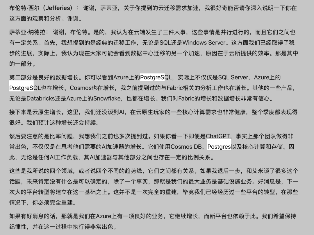 与此同时,微软 CEO 纳德拉在昨天的财报会议上多次提到了 PostgreSQL 的惊人表现:《纳德拉财报点名Postgres,助微软夺回市值第一》,PostgreSQL 赢得了资本市场的青睐。PG生态的公司几乎拿完了数据库领域的钱