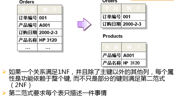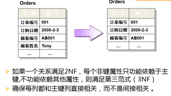 例如:订单表中需要有客户相关信息,在分离出客户表之后,订单表中只需要有一个用户id即可,而不能有其他的客户信息。因为其他的客户信息直接关联于用户id,而不是直接与订单id直接相关。