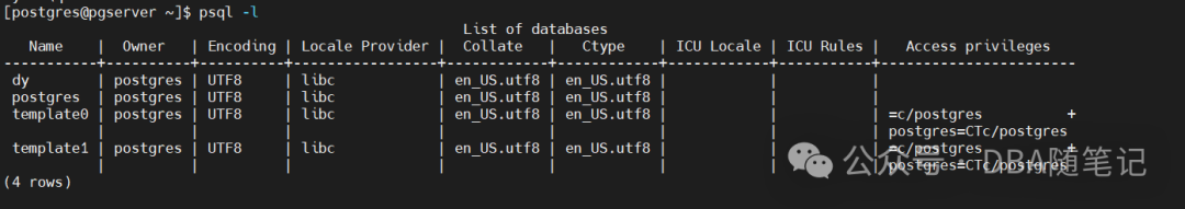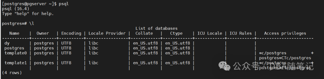 [postgres@pgserver pgdata]$ psql -h 192.168.40.10 -p 5432 -U postgres -d dyPassword for user postgres:psql (16.4)Type "help" for help.dy=#