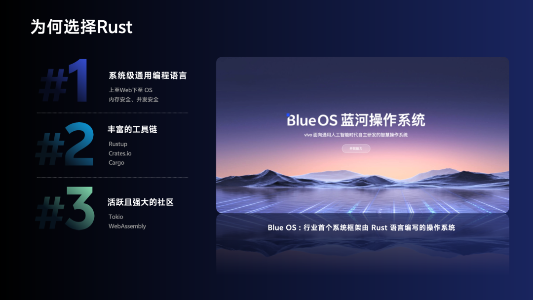 并且最近使用 Rust 构建应用的公司越来越多,比如我们公司的 Blue OS ,就是行业首个系统框架由 Rust 语言编写的操作系统,这也是我们坚定不移的选择Rust的重要原因之一。