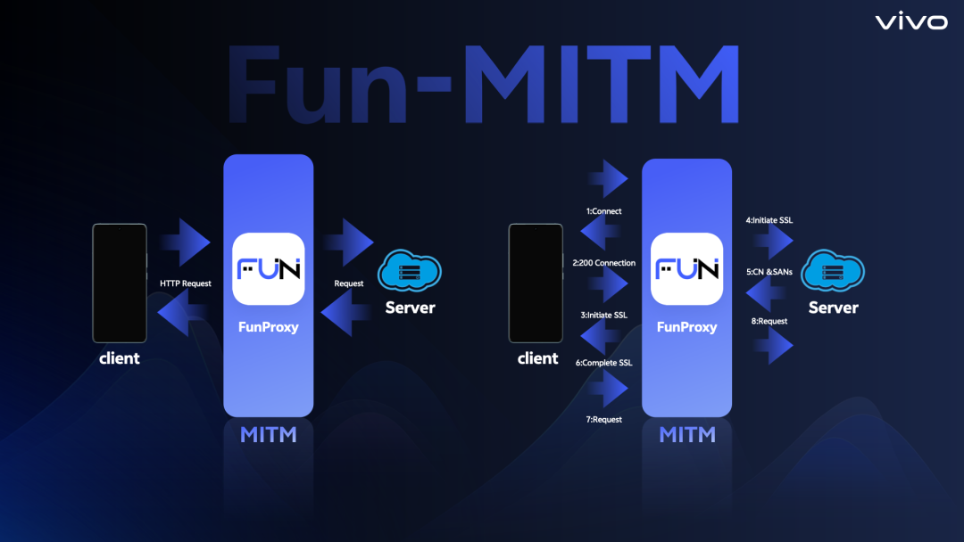 这是FunProxy的MITM(Man-in-the-Middle,中间人)方案。所谓的中间人,就是在服务端和客户端之间加入一个节点,这个节点负责接收客户端发送的内容,通过自己的规则然后再转发到服务端。我们这里用HTTP和HTTPS举例:
