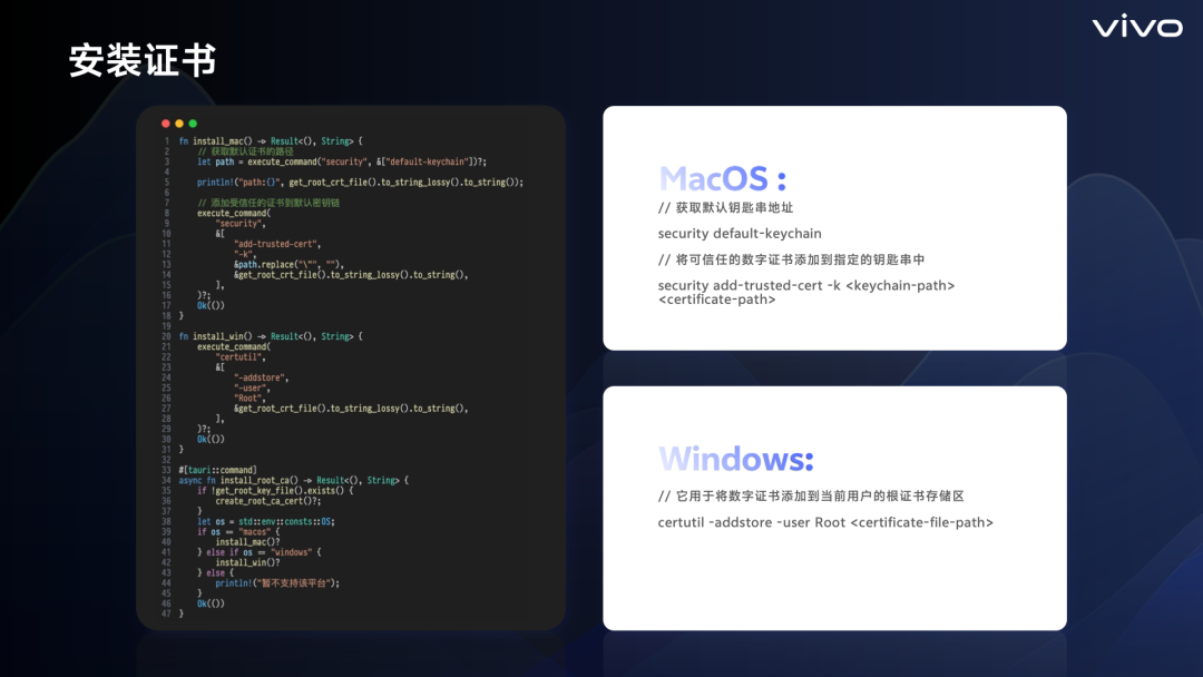 在使用FunProxy中可以自动安装并设置证书为信任。具体的是在macOS中调用security add-trusted-cert。在Windows中主要调用certutil方法具体的命令行和rust代码如图片所示: