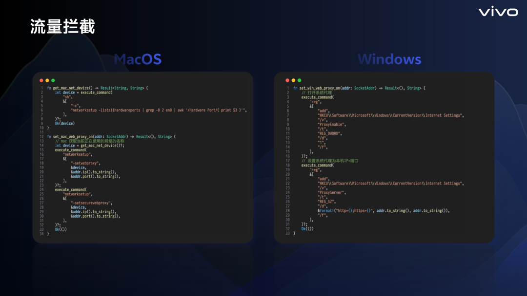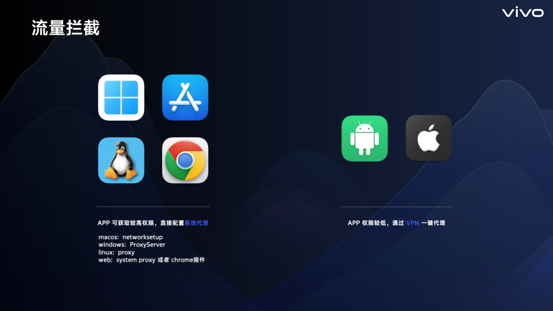 接下来给大家分享一下我们是怎么拦截流量的。首先是PC系统,比如Windows/macOS/Linux这些系统上,APP授权后可以获取很高的权限,所以我们直接调用系统提供的接口能力。