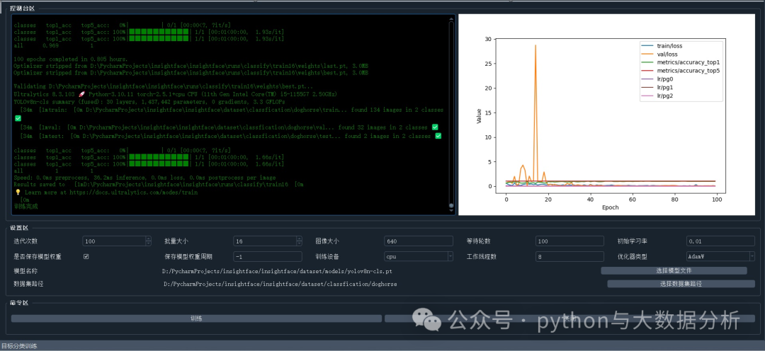 选择模型文件和数据集路径:点击相应的按钮,选择预训练模型文件(一般是models目录下的yolo8n-cls.pt 文件)和数据集路径(要训练的数据分类数据集根目录),选择后文件路径将显示在对应的主界面中。