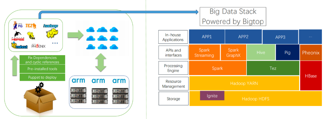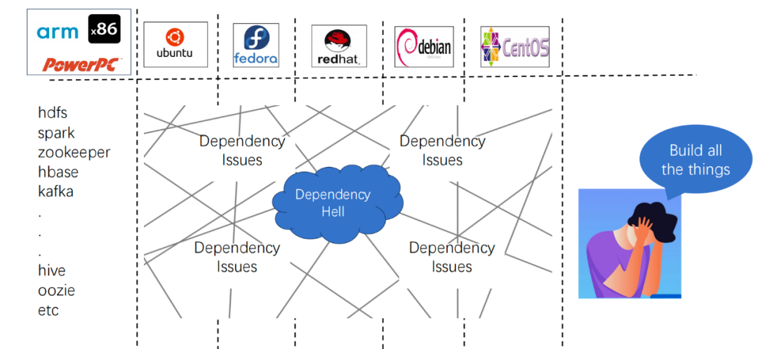 异构环境适配复杂化,跨架构和操作系统部署时,组件依赖(如 JDK 版本、底层库兼容性)需人工逐项适配,耗时且易引发运行时冲突 版本兼容性管理粗放,Hadoop 生态组件(如 HDFS、Spark、HBase)版本组合缺乏系统性验证,导致生产环境频繁出现接口不匹配、数据读写异常等问题 运维自动化程度不足,集群部署、配置更新、故障恢复依赖手工操作,尤其在混合云场景下,跨集群策略同步困难,资源利用效率低下。这些问题严重制约了大数据技术栈的快速落地与规模化扩展,亟需系统性解决方案。