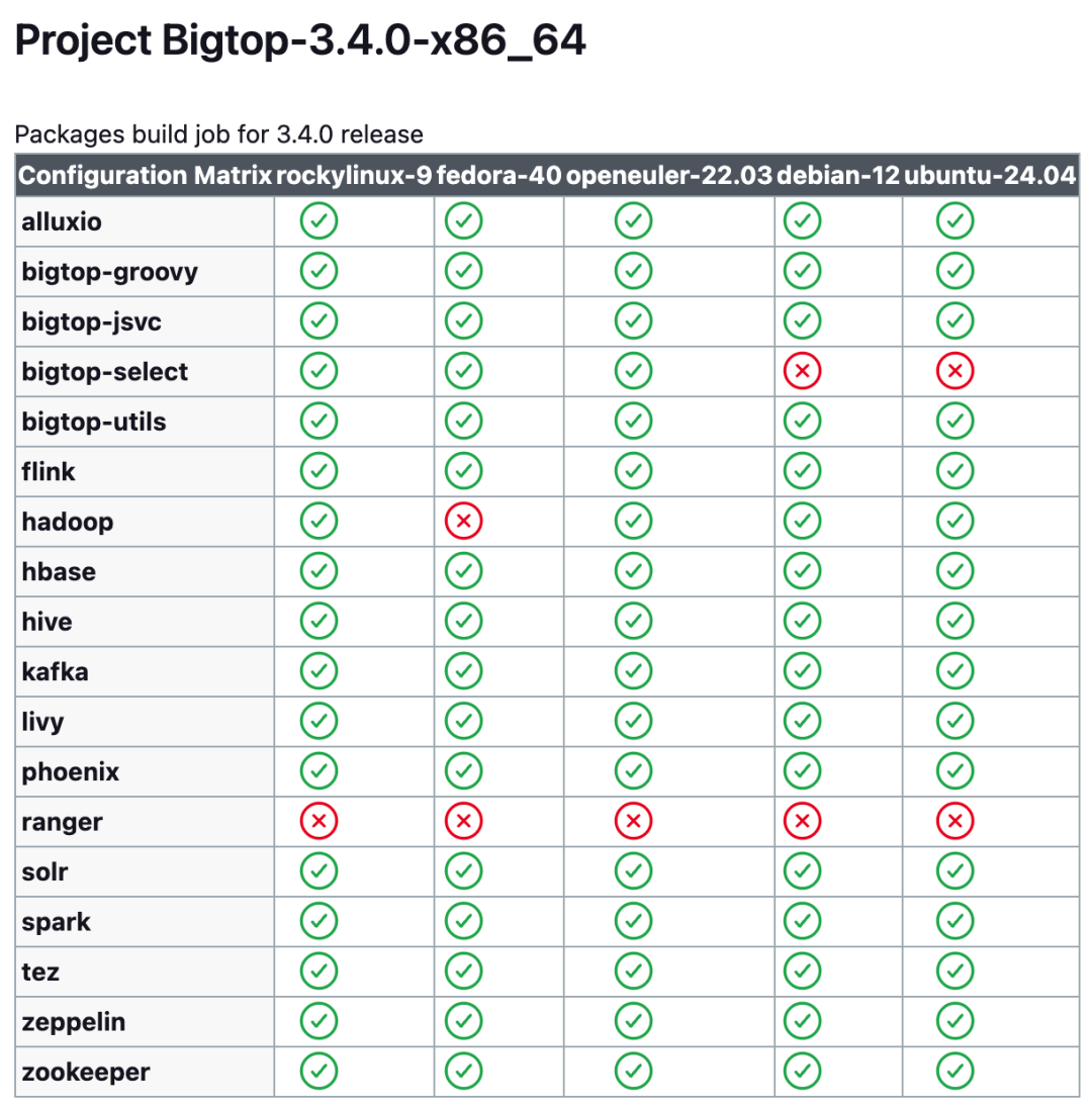 支持最新操作系统版本: 深度适配 openEuler 22.03、Ubuntu 22.04 等主流OS最新发行版,并确保组件与 OS 内核、基础库无缝协同。 追踪上游版本及 BUG 修复: 团队及时跟进大数据组件漏洞及版本更新,为社区提供更加可靠的组件版本。 Jenkins自动化验证兼容性: Jenkins 定期进行跨系统及架构的构建验证,修复失败的构建保证其兼容性。 原生多架构二进制包分发: 提供 x86_64/ARM64 架构的 RPM/DEB 原生包,用户可直接安装无需了解内部细节。