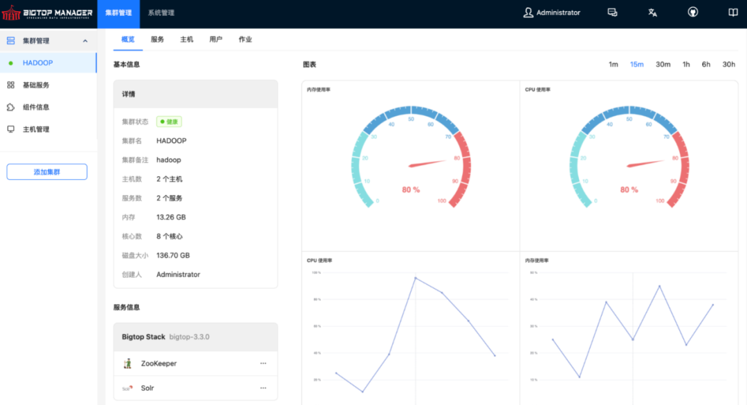 多集群管理:独立管理多个物理隔离的 Hadoop 集群(如开发/测试/生产环境),通过统一的 Web 页面进行运维,且提供基础服务进行监控告警等功能的全局管理。 多 Stack 混合部署 · Bigtop Stack: 托管 Bigtop 官方构建的 Hadoop/Spark 等组件,为用户提供一批版本互相兼容的、多架构适配的、跨平台一致的组件。 · Extra Stack: 支持集成非 Bigtop 构建的第三方服务,通常为与其他大数据组件版本依赖性不强的社区组件,或用户自研的组件。