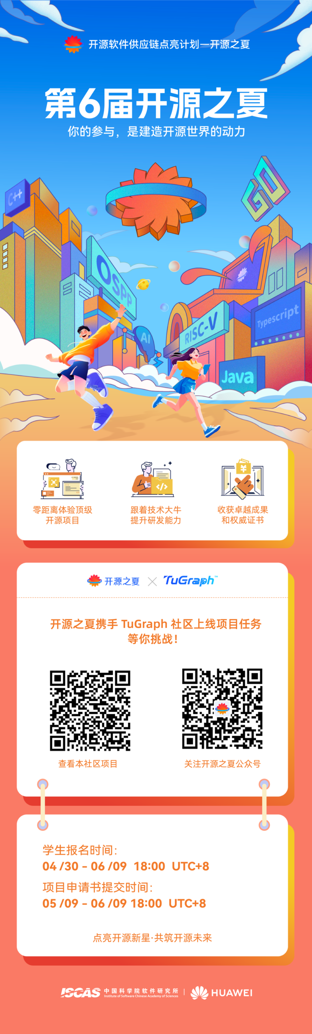 TuGraph 社区在开源之夏的4个项目都已上线,只要你对图数据库、Graph+AI 有浓厚兴趣且有技术基础,欢迎申报 TuGraph 图数据库社区项目,开启一个难忘的极客夏天。