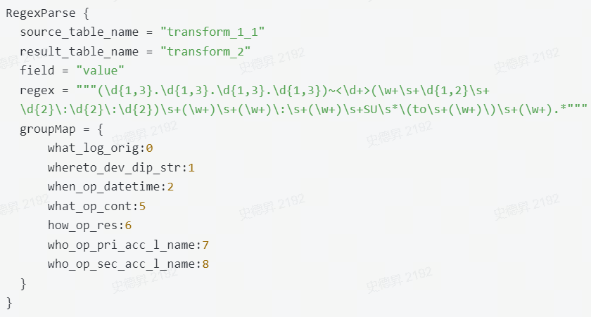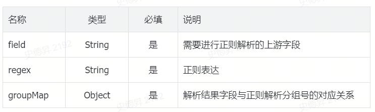 source_field: 需要解析的原始字段 regex: 正则表达式,例如 (\d+)-(\w+) groupMap: 解析的结果字段与正则捕获组索引的对应关系