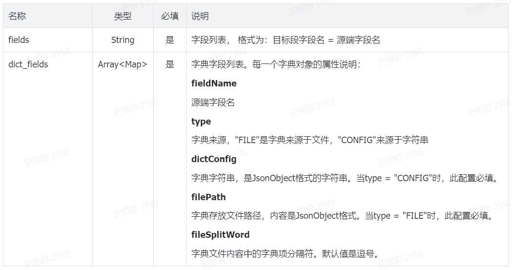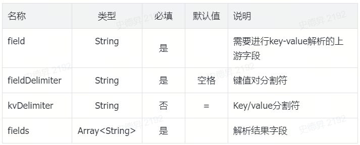 source_field:上游key-value值字段 field_delimiter: 键值对分隔符(如 ;) kv_delimiter: 键和值的分隔符(如 =) fields: 映射的目标字段key集合