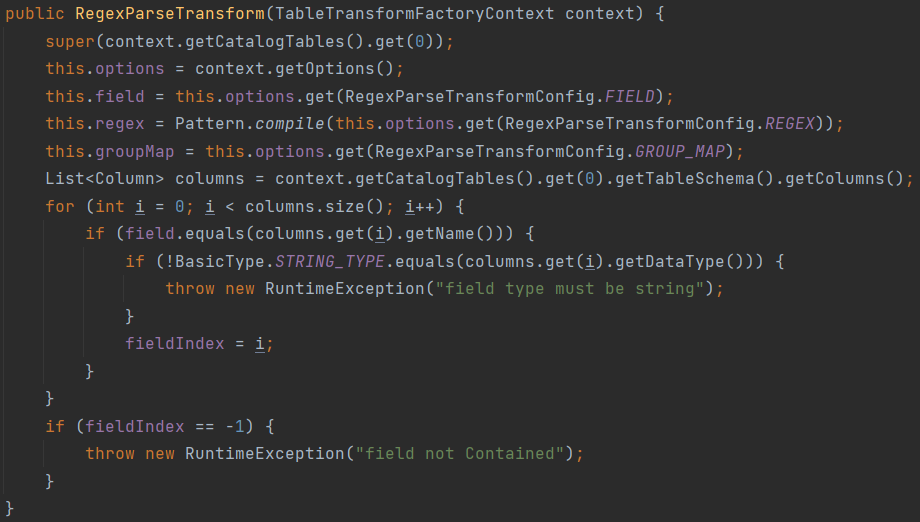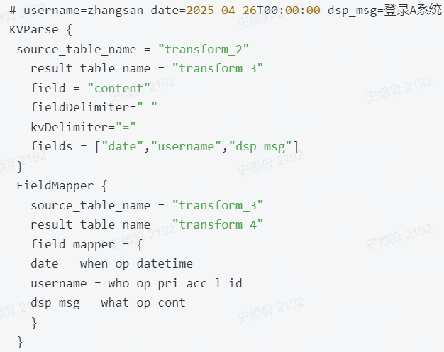 确定需要解析的上游字段(field) 编写正则表达式(regex)。通过配置文件定义正则表达式模式,其中使用捕获组(capture group)标识需要提取的关键数据片段 确定结果字段与正则捕获组的对应关系(groupMap)。seatunnel读取原始数据后,会逐行应用预定义的正则表达式进行模式匹配,自动提取各捕获组对应的数据内容,并将这些提取结果映射到预先配置的目标字段中