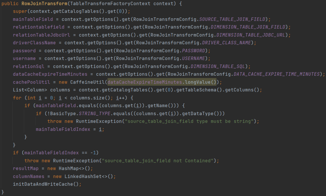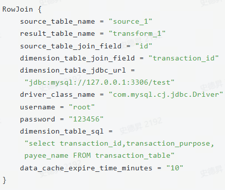 确定来源字段与维度(关联)表字段 配置辅助数据源的jdbc连接、驱动、用户名和密码,支持配置任意jdbc类型的数据库 自定义SQL补全数据。rowjoin组件结合配置的数据库连接等信息,连接到具体数据库并执行sql,将sql查询的数据写入到caffeine缓存中,利用caffeine的过期机制来刷新数据,当数据过期会再次执行SQL获取结果数据。