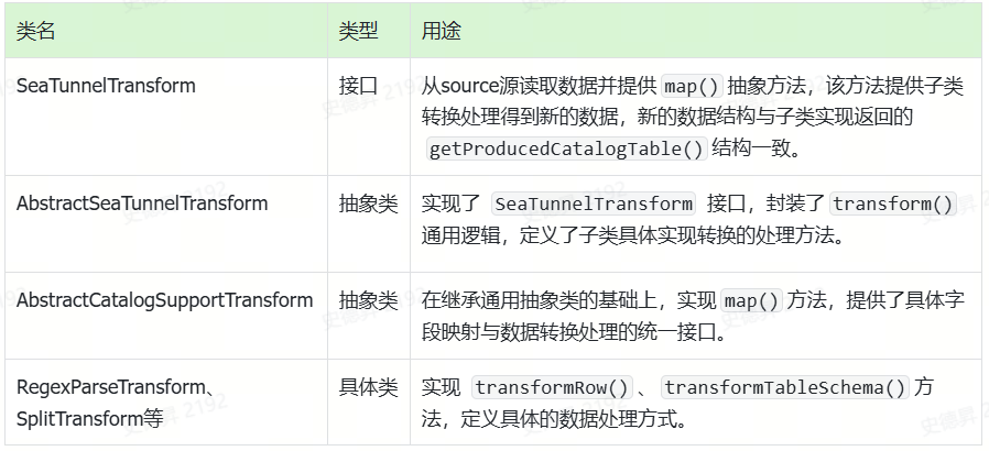 SeaTunnel的数据处理与转换API通过抽象类和接口定义了转换操作的基本框架和行为,具体的转换操作类通过继承和实现这些抽象类和接口,完成特定的数据转换逻辑。这种设计使得SeaTunnel的转换操作具有良好的扩展性和灵活性。
