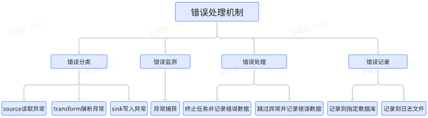 在大规模数据处理任务中,少量异常数据不应导致整体任务失败。我们设计了一套“错误分类➡️检测➡️处理➡️记录”闭环机制,确保在海量数据处理过程中,对各类异常进行处理。