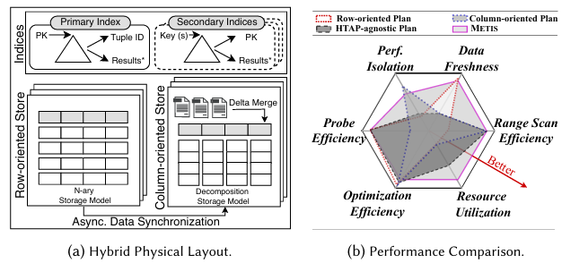 如图a中,面向行的存储(简称行存储)将数据按行存储,针对一次操作单个数据元组和访问多个属性进行了优化,适合OLTP;面向列的存储(简称列存储)将不同行的相同属性连续存储在列中,针对一次访问大量行和部分元组属性进行了优化,适合OLAP。为了在新数据上提供快速的OLAP功能,更新会从行存储异步复制到列存储,同时对OLTP的影响最小。同时,利用混合物理布局,METIS在HTAP的性能、隔离性和时效性之间取得了实际的平衡。