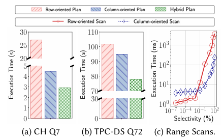 作者通过实验说明混合计划的动机,并展示混合计划生效的实际场景,如图在两个经过充分研究的基准测试上进行了实验:CH-benCHmark和TPC-DS。通过比较混合计划与行存储和列存储计划中较快者的执行时间,评估结果表明,对于许多给定的查询,无论是行存储计划还是列存储计划都不是最优的。在CH-benCHmark中,22 个查询里有9个从混合计划中受益,几何平均加速比达到1.68倍;在TPC-DS中,99个查询里有77个(即77.8%)从混合计划中受益,加速比达到3.06倍。