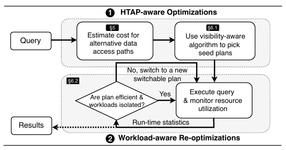 在此问题下,作者为混合计划开发了一种新的资源的查询重新优化方法。与调度资源或限制资源使用不同,重新优化方法可以自动适应工作负载的变化。当检测到高资源争用时,它会通过机会性地将先前优化计划中的高效子计划组合成一个新的良好计划来重新优化计划,这样可以在不进行整个计划重新优化的情况下缓解资源争用。