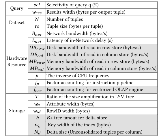 Demain各参数如表所示,从四个角度对HTAP中的访问路径进行建模:查询、数据集、硬件和存储。本文的成本模型以范围扫描为目标,范围扫描通常根据给定的预测条件筛选数据。比如以下一个SQL示例: