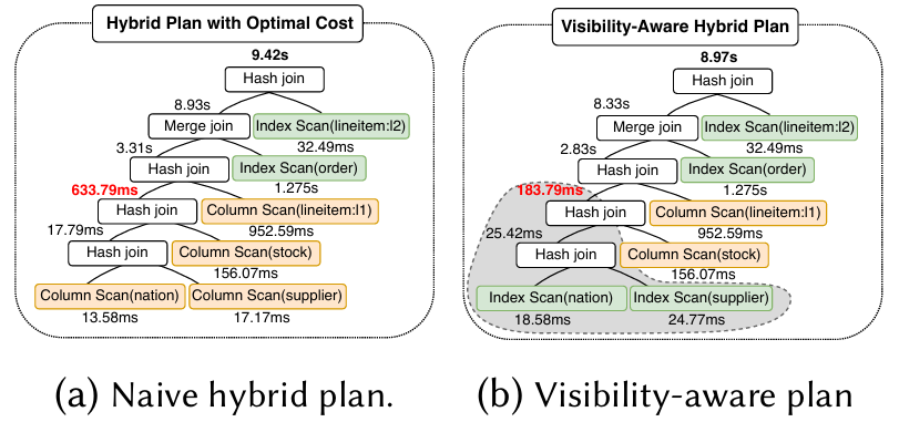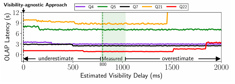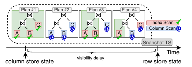 在查询优化中考虑可见性延迟是一个重要的研究问题,因为尽管现有的多项工作都在努力从系统层面最小化行存储和列存储之间的可见性延迟,但根据部署情况,可见性延迟仍然很明显。