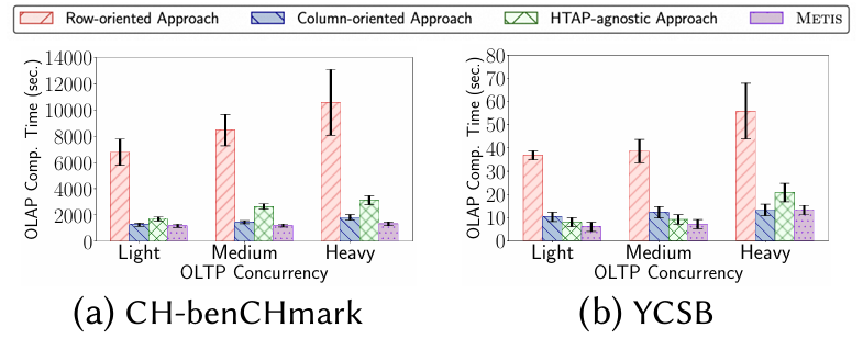 对于YCSB工作负载,实验结果表明,在轻量级和中等OLTP并发下,使用与HTAP无关的计划的方法和METIS都能生成最优计划。METIS的性能略好,因为METIS的可见性计划选择算法可以提前安排在行存储上的执行(即所有数据在增量存储中均可用)。在高OLTP并发下,METIS切换到列存储计划,以缓解行存储上的资源竞争。而与HTAP无关的方法仍使用混合计划,导致性能欠佳(。