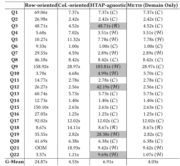 表格展示了分析查询的延迟。对于与HTAP无关的方法和仅使用Demain的METIS,用R标记生成的行存储计划,用C标记列存储计划,用H标记混合计划。总体而言,METIS的表现优于其他三个竞争对手。和与HTAP无关的方法相比,METIS的几何平均加速比达到1.72倍。