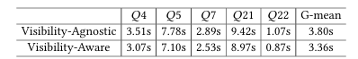 结果显示,尽管可见性计划在检索数据时可能花费更多成本,但其延迟比“最优”成本计划更短(即8.97s对9.42s)。